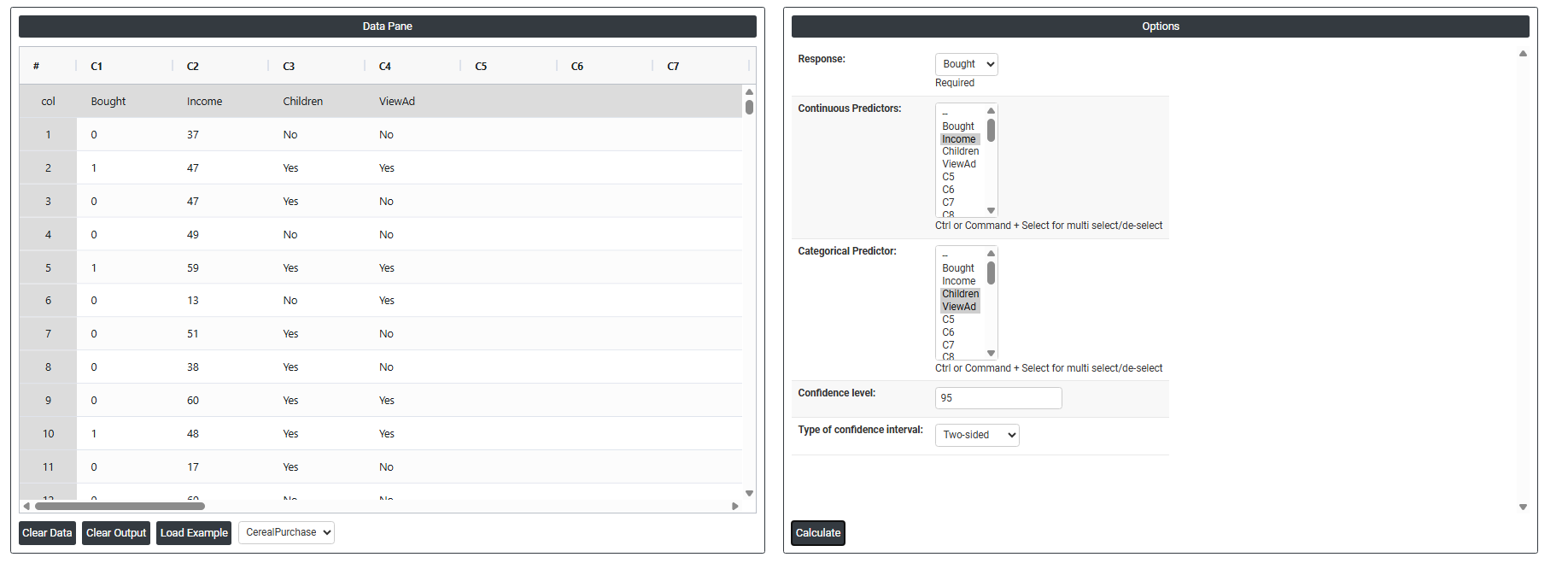 On the dashboard of Binary Logistic Regression, the window is separated into two parts.