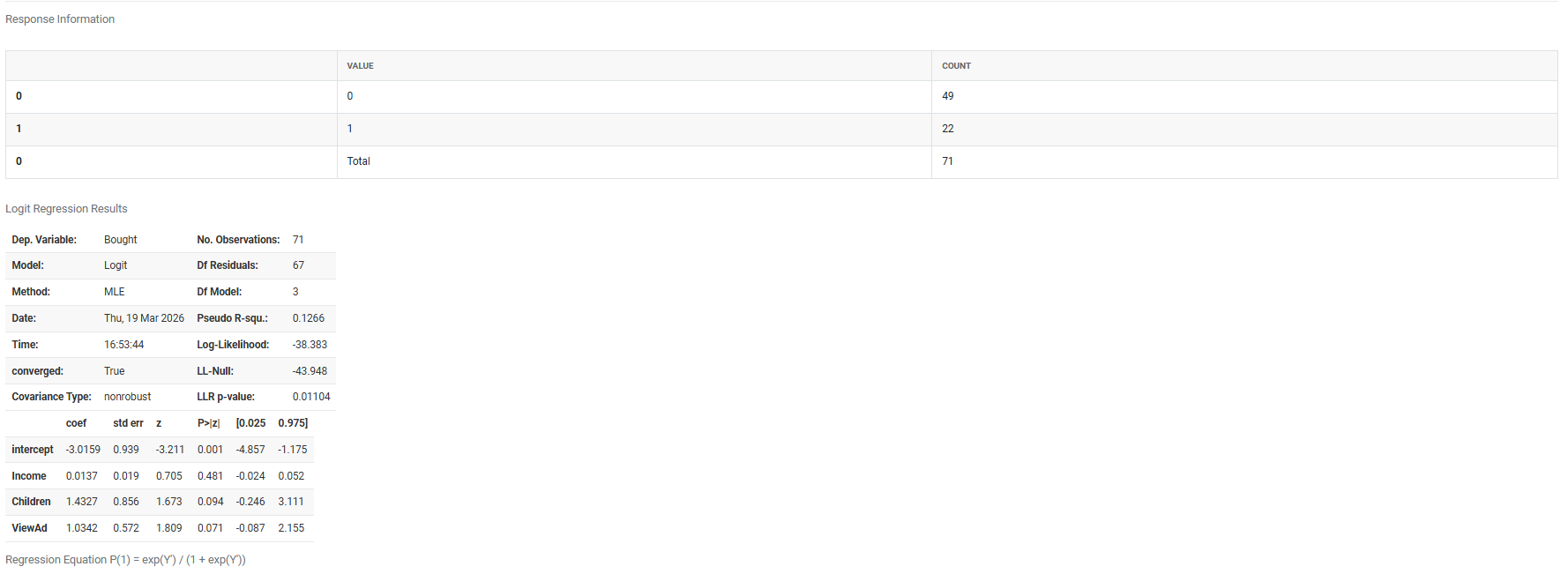 Confidence Interval A range of values within which the true result is likely to fall. The default is 95%, meaning you are 95% confident the true probability or coefficient lies within that range. It is set at 95% by default as it is the widely accepted standard that balances statistical reliability with practical usability — narrow enough to be useful, wide enough to account for uncertainty.