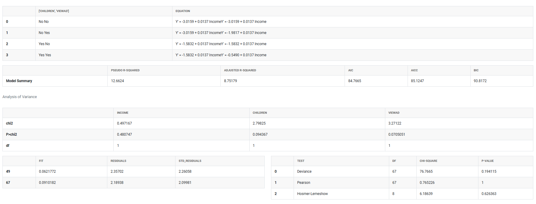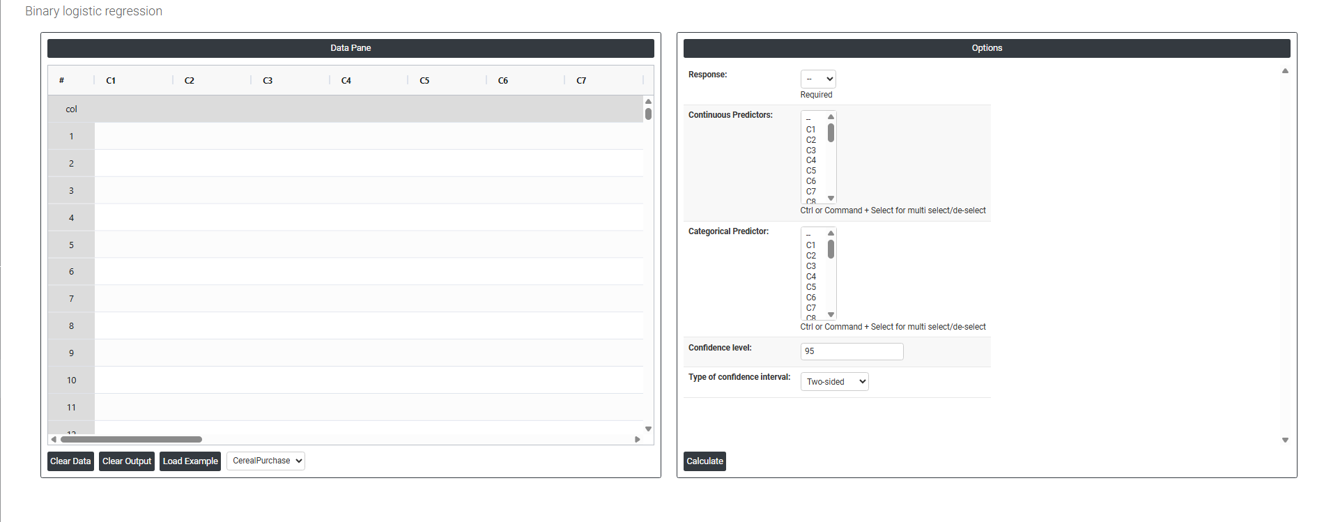Response The outcome variable you are trying to predict it must contain exactly two categories, such as pass/fail, yes/no, or defective/non-defective. The model calculates the probability of one category occurring over the other based on the predictor values entered.