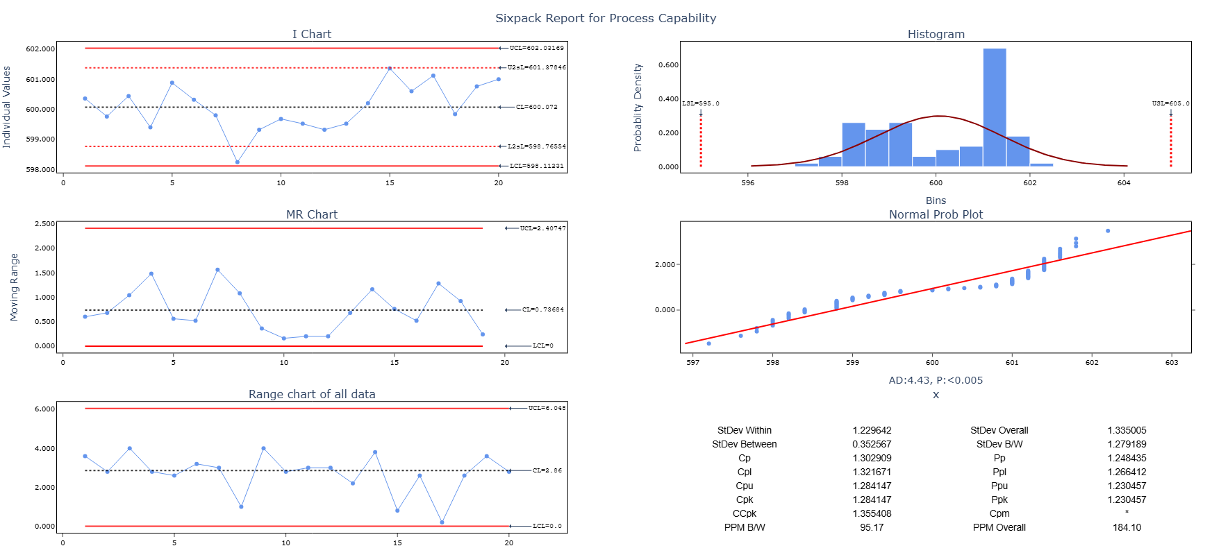 A quality engineer at an automotive parts plant monitors the lengths of camshafts. The engineer collects data in subgroup sizes of 5 every 30 minutes from one of the machines. He is interested in understanding how capable is the manufacturing process in meeting customer specification of LSL = 595, Target = 600 & USL = 605. The following steps: