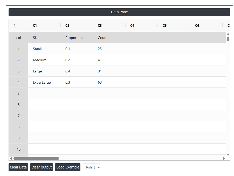 - Properties Specified by Historical Counts (Input Column) — tests against expected proportions derived from a reference column of historical counts rather than manually entered values. Use this when you have a previous dataset or baseline period whose distribution you want to compare your current data against.