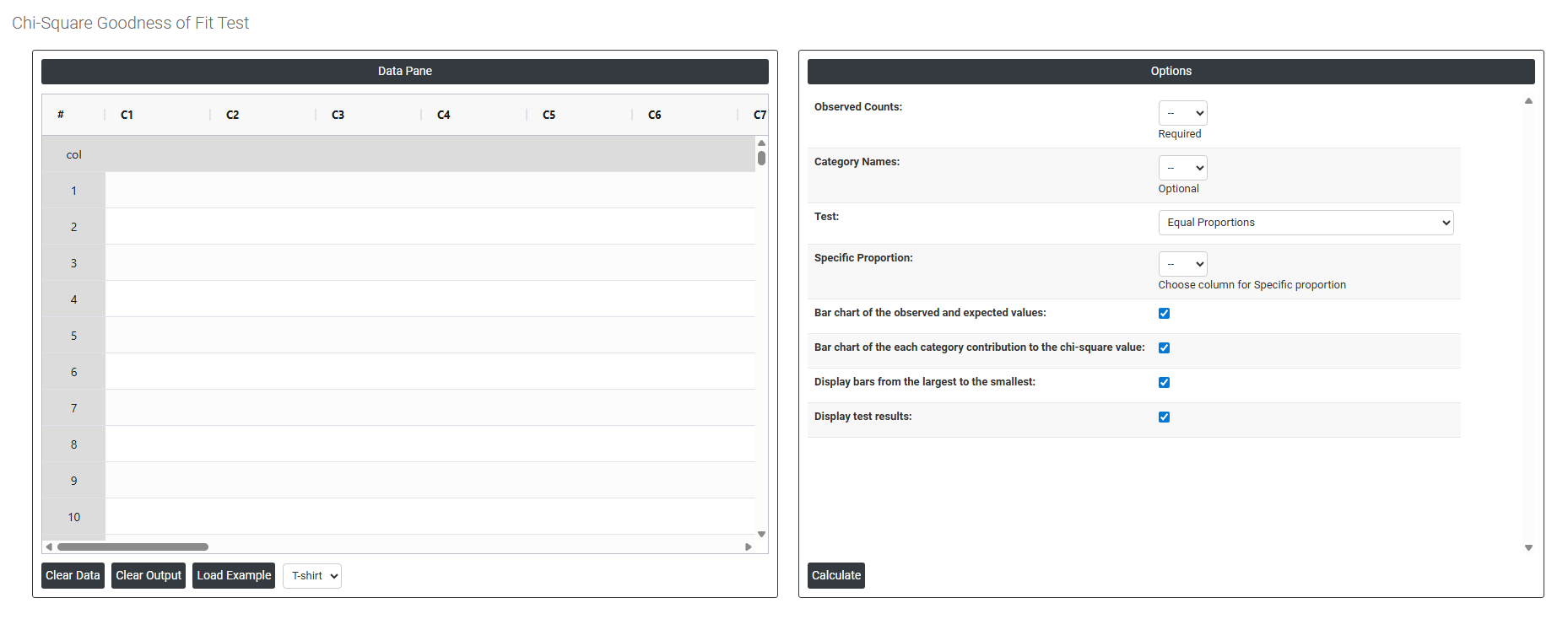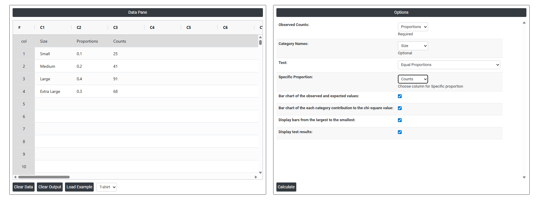 - Test: Defines what expected distribution the observed counts are being compared against. Three options are available: