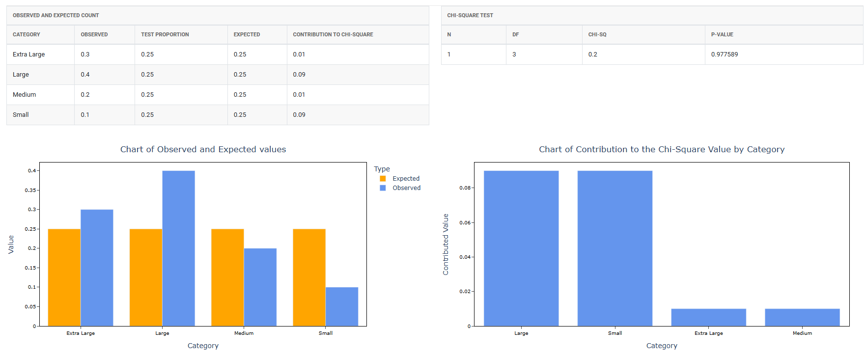 - Bar Chart of Observed and Expected Values: When enabled, displays a side-by-side bar chart comparing the observed counts against the expected counts for each category. This is one of the most useful visual outputs — it makes it immediately clear which categories have the largest gaps between what was observed and what was expected, helping you pinpoint where the distribution deviates most.