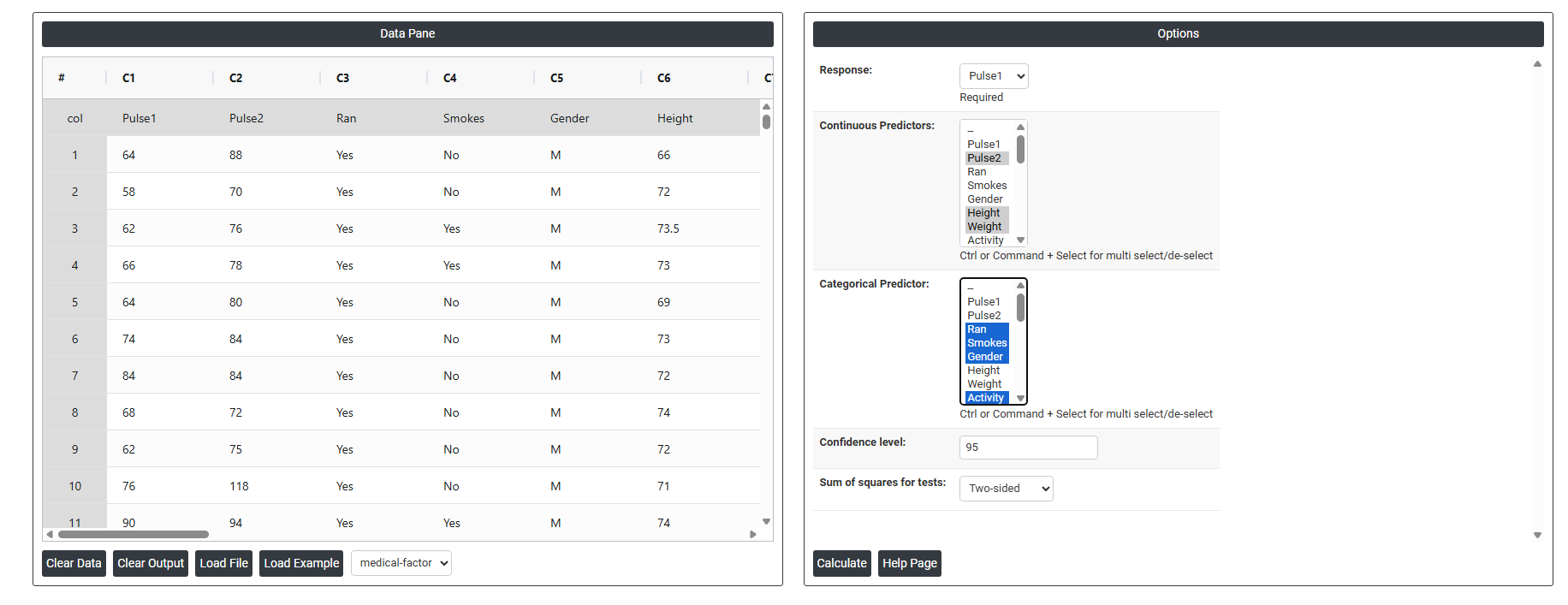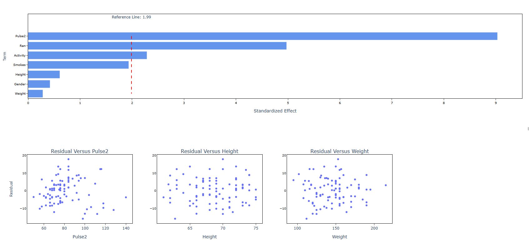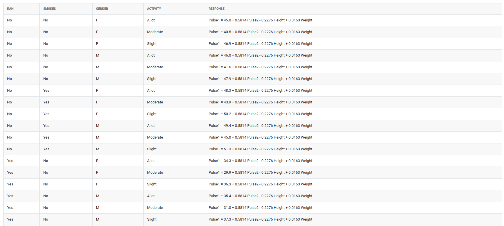 A medical researcher wants to study the effects of various factors on pulse rates. The researcher records the height, weight, gender, smoking preference, activity level, and resting pulse rate of 91 undergraduate students. The researcher then randomly divides the students into two groups. The first group runs in place for a minute while the other group stands still. Then, the researcher records the students' pulse rates again. The following steps: