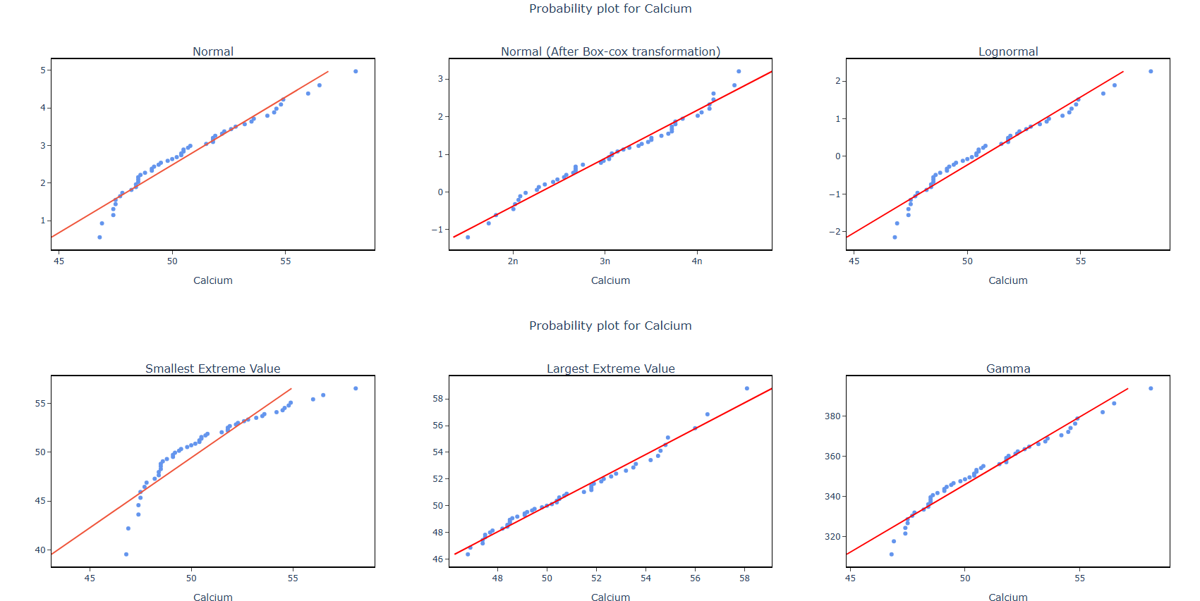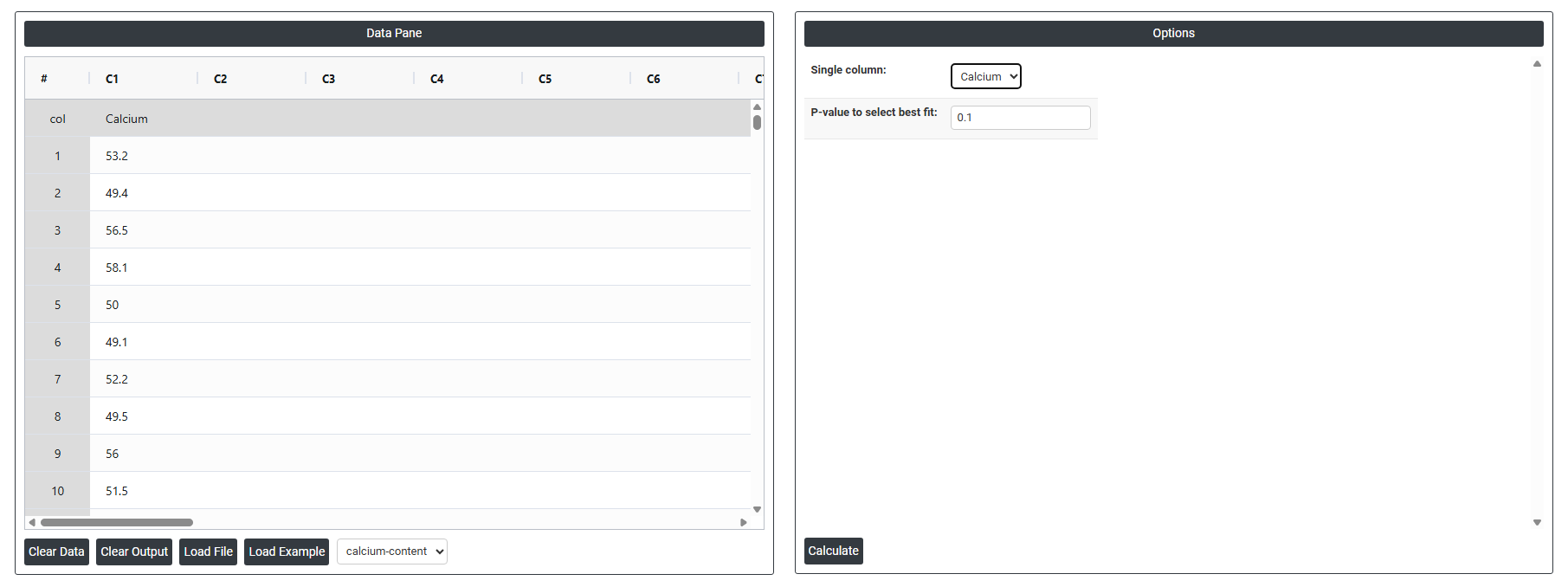 - Single Column: Select the column containing the continuous data you want to fit distributions to — for example, measurements such as calcium levels, cycle times, tensile strength, or particle sizes. The tool will take all values in this column and simultaneously test them against multiple probability distributions to determine which one best describes the shape and behaviour of your data. Only one column can be selected at a time as each variable is evaluated independently.
