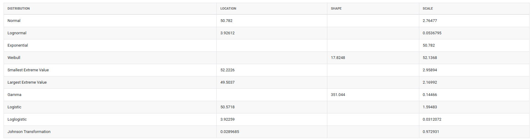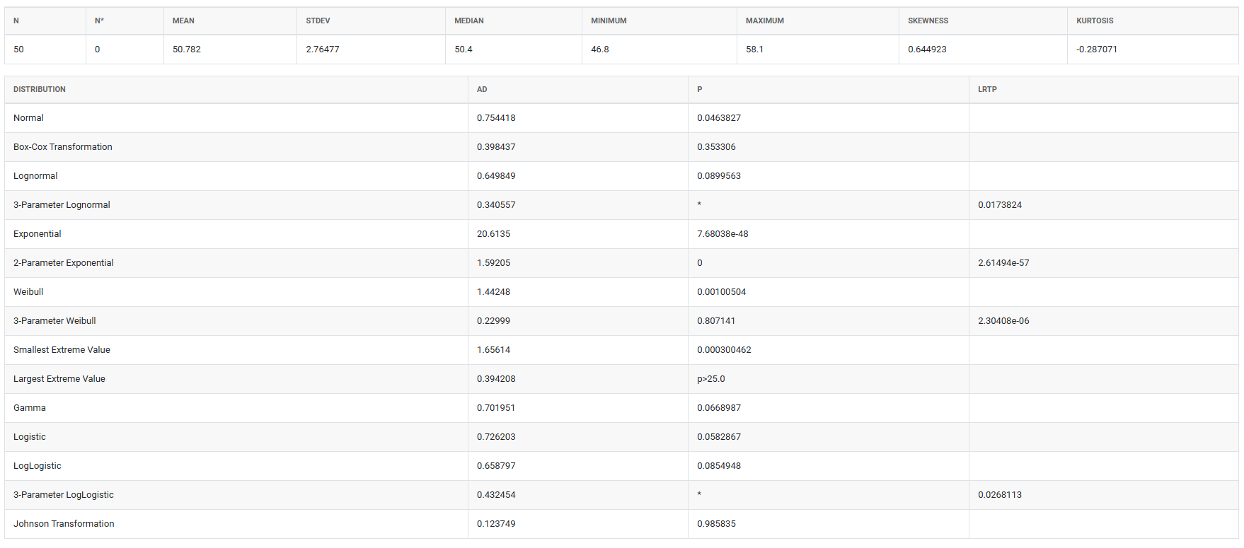 - When multiple distributions produce acceptable p-values, choose the one with the highest p-value as the primary candidate — but always combine this with a visual review of the probability plot and consider whether the selected distribution makes physical sense for your process. A distribution that fits statistically but has no logical basis for your data type should be questioned before use.