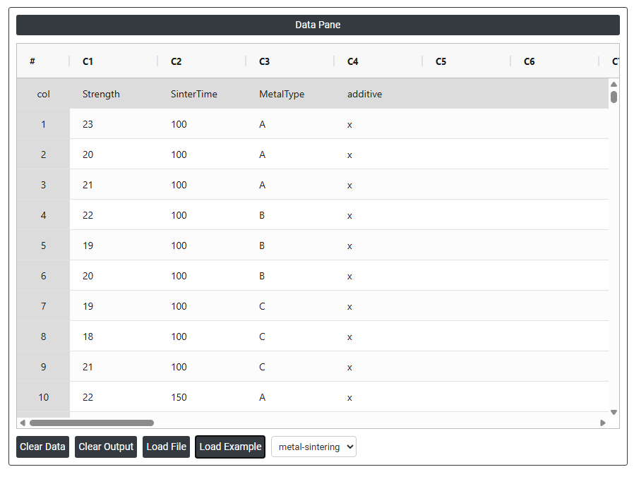 An engineer wants to assess the effect of sintering time and an additive on the compressive strength of three different metals. The engineer measures the compressive strength of three specimens of each metal type at each sintering time: 100 minutes, 150 minutes, and 200 minutes repeated for each of the additives. The following steps: