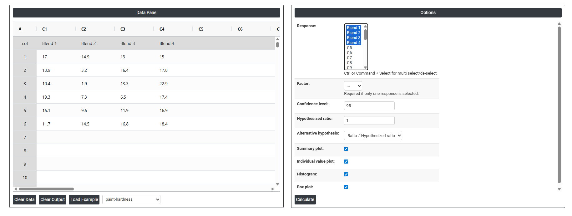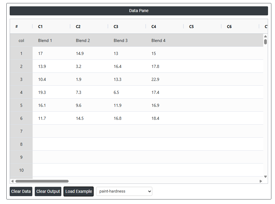 The chemical engineer intends to evaluate the hardness of four different paint blends by applying six samples of each blend to a metal piece, curing them, and measuring their hardness. To test for the similarity of means and to examine the variations between pairs of means, the analyst employs one-way ANOVA with multiple comparisons. The following steps: