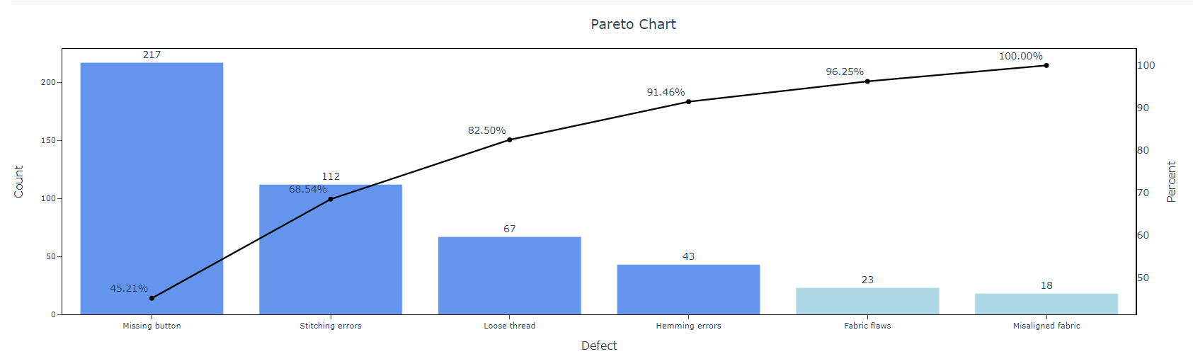 - Trailing color: The color used for the cumulative line that runs across the chart, illustrating the cumulative percentage of the total number of defects or occurrences. This line helps visualize the concept of the Pareto Principle, where a small number of causes often account for the majority of the problems.