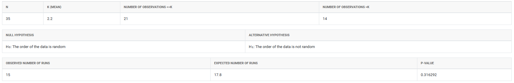 - Very small samples (fewer than 10) may not provide enough runs for reliable non-randomness detection.