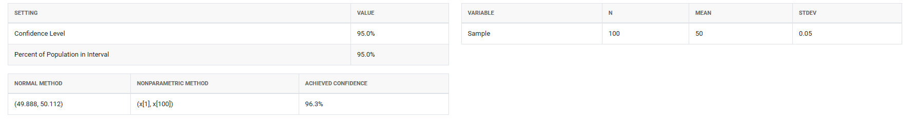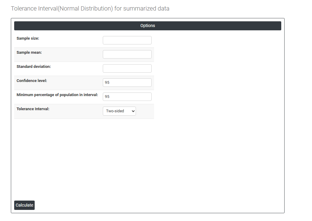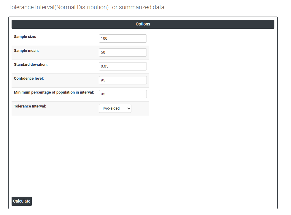 - Confidence Level: Sets the level of certainty that the calculated interval genuinely contains at least the specified proportion of the population. The standard default is 95%, meaning you are 95% confident the tolerance interval covers at least the minimum percentage of the population you specify. A higher confidence level (e.g. 99%) produces wider bounds with greater certainty; a lower level (e.g. 90%) produces narrower bounds but with reduced assurance that the coverage requirement is truly met.