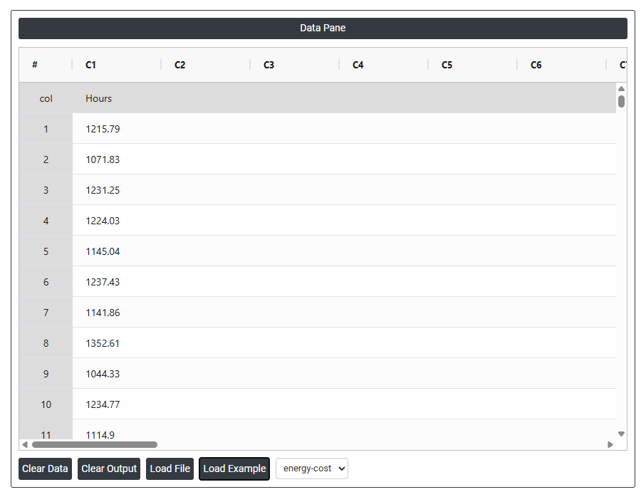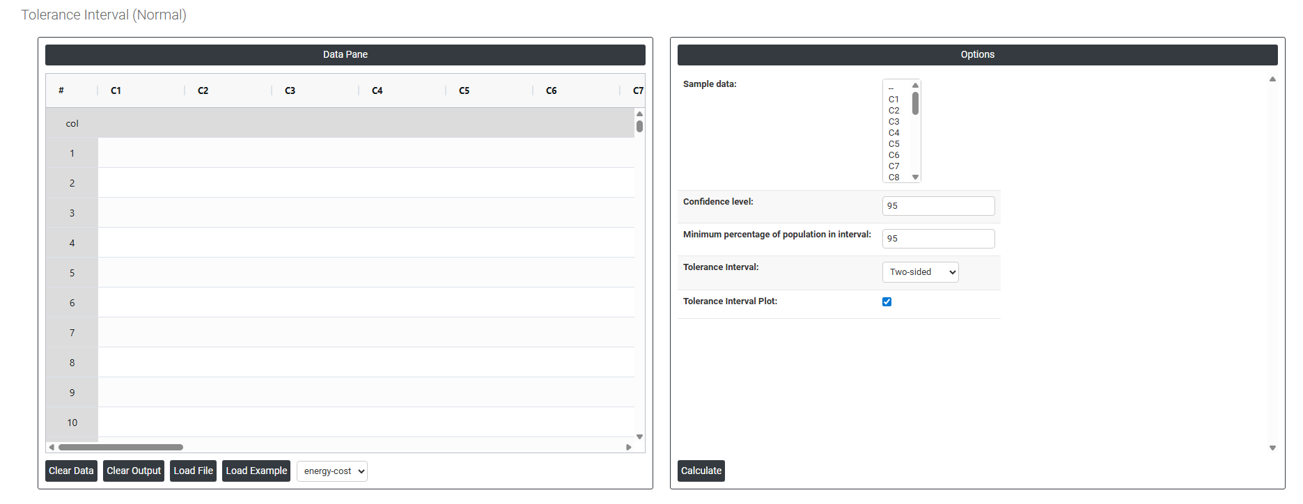 - Sample Data: Select the column containing the raw continuous measurements you want to calculate a tolerance interval for — for example, energy costs, dimensions, weights, or temperatures. The tool uses all values in this column to estimate the process mean and standard deviation, which are then used to calculate the tolerance interval bounds. The data in this column must be approximately normally distributed for the results to be valid.