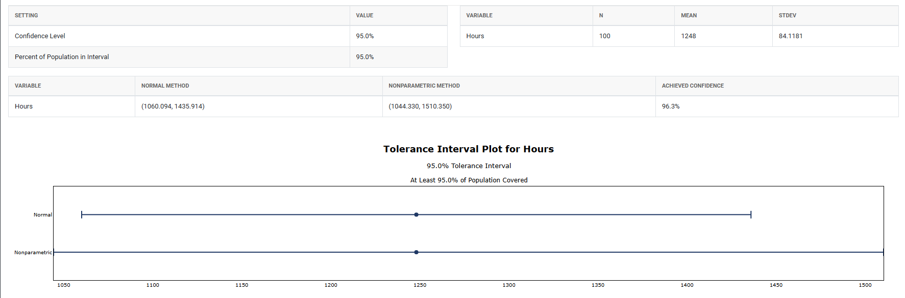 - Confirm normality before using this method — use a normality test or probability plot first. If data is non-normal, the tolerance interval will be inaccurate.