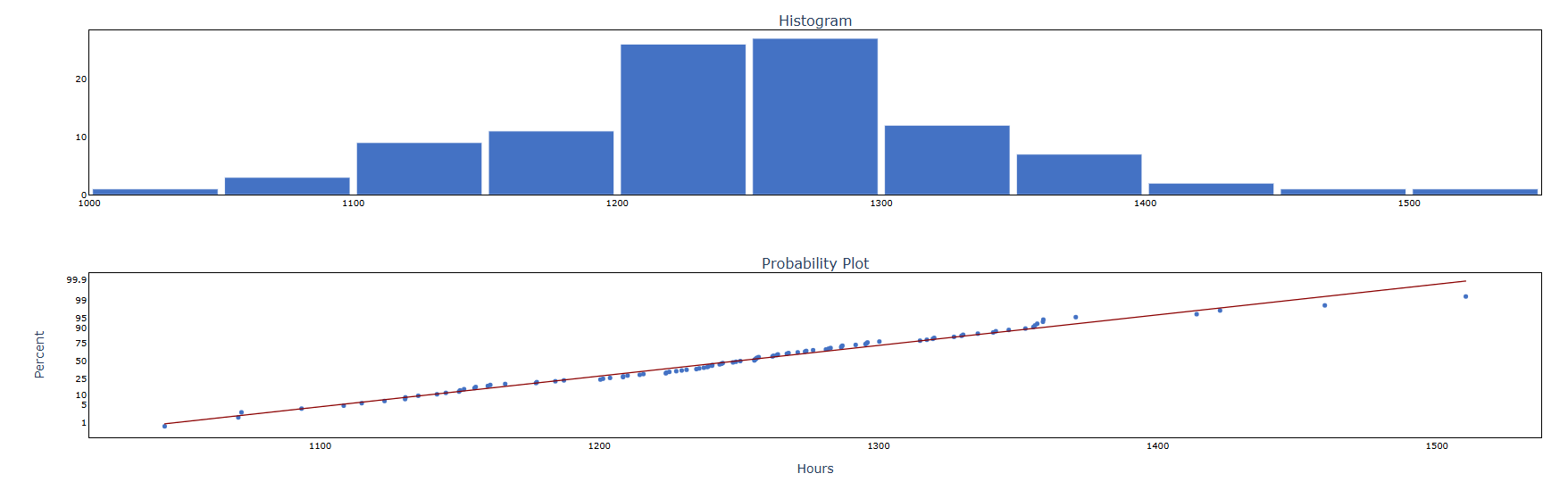 A quality engineer needs to evaluate how long light bulbs last in a manufacturing facility. A sample of 100 bulbs is tested and their individual burn times are recorded until each bulb fails. The goal is to establish a lower tolerance bound the minimum burn time that at least 95% of the entire light bulb population is expected to surpass. The test in following steps: